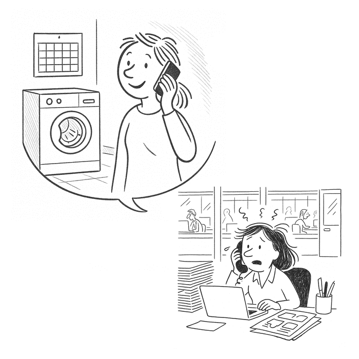 « Voici la situation : Cette personne appelle un voisin pour lui demander de l’aider avec son linge, car aujourd’hui c’est son jour à la buanderie commune, mais elle est en retard au travail. Je suis le voisin au téléphone, et vous jouez le rôle de cette personne. »